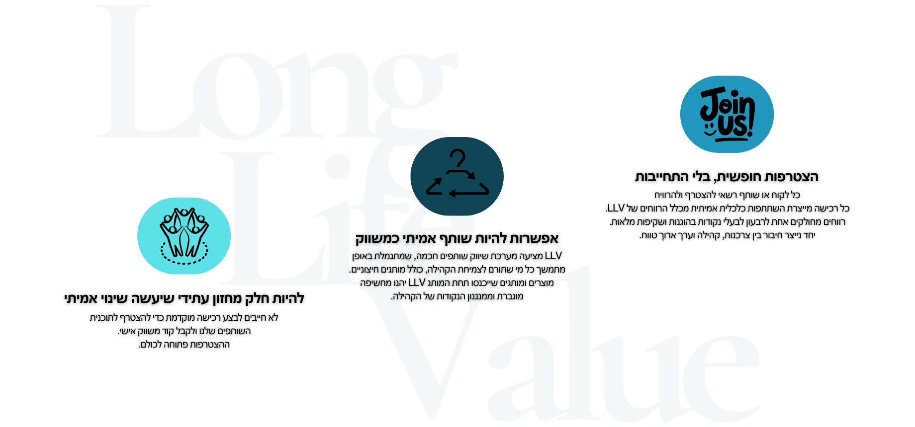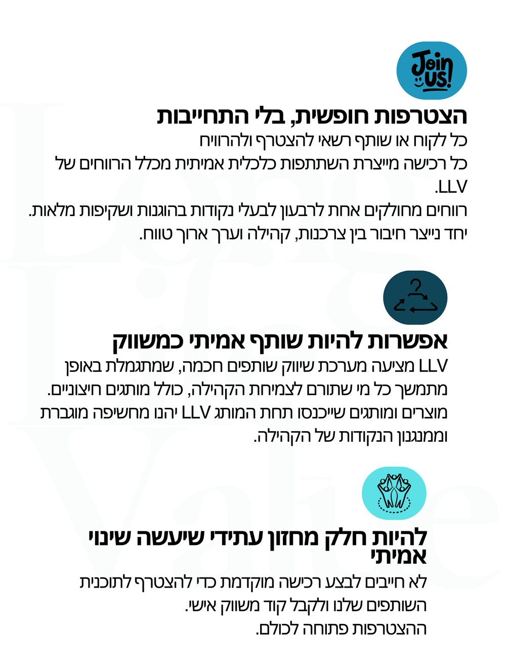 LLV היא פלטפורמת מסחר דיגיטלית הפועלת לפי עיקרון אחד פשוט: "ערך שחוזר לקהילה."